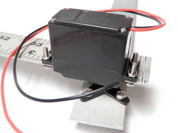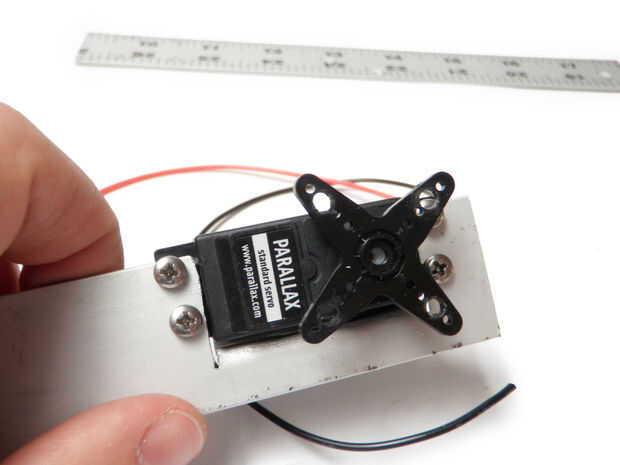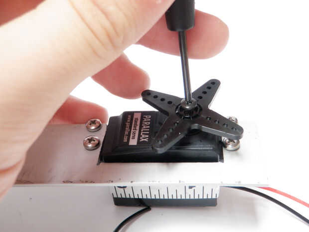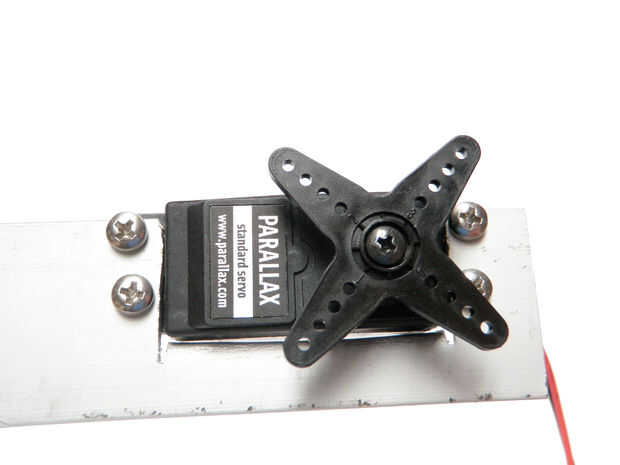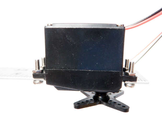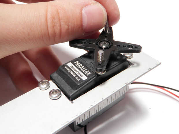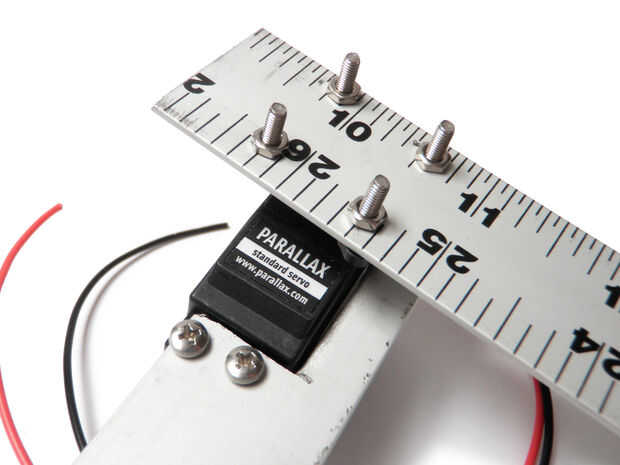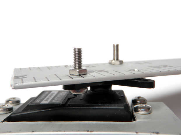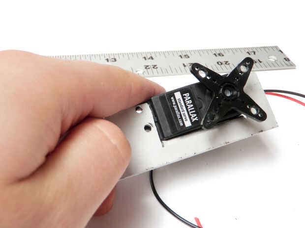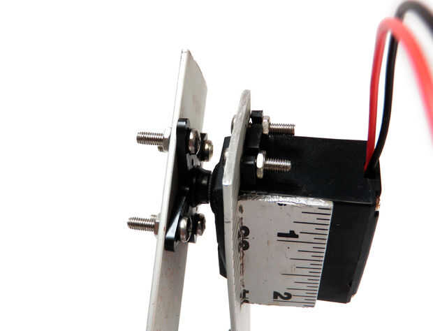 Fije el cuerno del el motor servo, si no lo ha hecho ya. Usar tornillos y tuercas para fijar la otra sección de la regla para el cuerno del servo. Otra vez, las cabezas de los tornillos deben ser mirando hacia el interior hacia el otro conjunto para asegurar un perfil bajo.