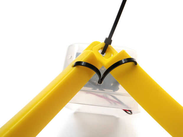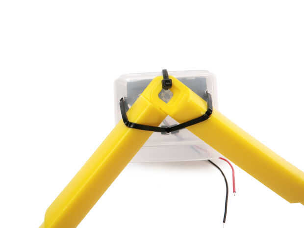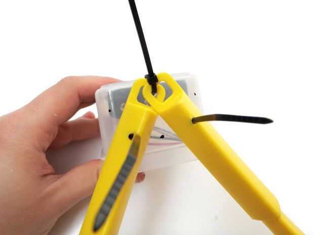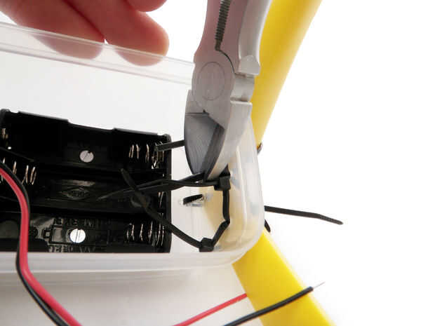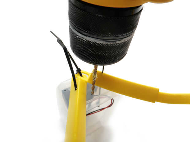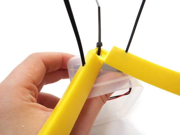 Turn the plastic container upside down. Marca, el taladro y amarra los dos restantes friega cepillos al frente del envase de plástico que se encuentran en un ángulo de 90 grados y uniformemente hacia abajo del punto en el sentido de abrir el envase de plástico.