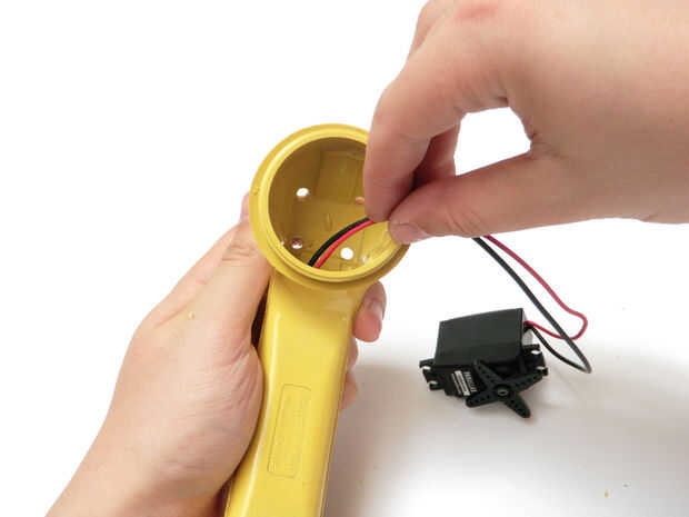 a partir del lado del terminal enfrente de donde estaba el gato, pasar los cables del motor a través del cuerpo del teléfono y el orificio creado mediante la eliminación de la toma.