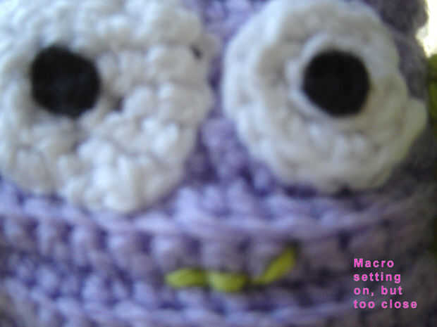 Este botón activa el ajuste de macro en su cámara para que usted puede tomar fotos cerca. Como se puede ver en los ejemplos anteriores, la primera foto es con el ajuste de macro y la segunda con la macro de ambos tomados de la misma distancia del objeto. La tercera foto es con el ajuste de macro pero la cámara es demasiado cerca el tema, ten en cuenta las limitaciones de tu cámara, sólo se puede obtener tan cerca del tema (consulta el manual de la cámara o probar la distancia).