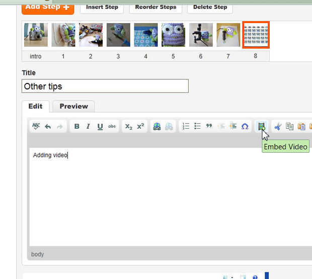 - En su instructivo (paso a paso) editor, pinche en el icono Insertar vídeo