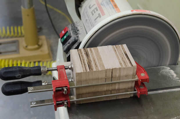 Sujete todas las piezas juntas para formar un gran bloque de 'madera'. Use la lijadora de disco para aplanar los tres lados expuestos. Me Deslice el bloque de izquierda a derecha y notó que esto causó a una especie de efecto de la ensambladora, donde tomaría una rebanada apagado. El exterior del disco se arena más rápido, por lo que un movimiento deslizante asegura lijado más consistente.