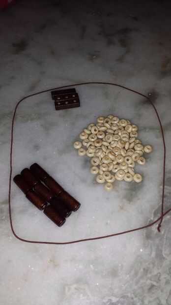 He hecho 3 pulseras para que el método de preparación es el mismo para todos. Ahora me explico cómo se hace la pulsera con 3 capas. Para esto he utilizado 3 tipos de cuentas con varias formas. Uno con la forma cilíndrica, la otra barra con 3 agujeros y el otro grano normal.