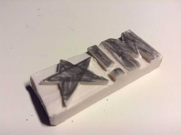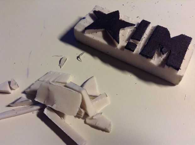 Usando su cuchillo, lentamente detrás para tallar lejos en el borrador en la forma que desee estampar. Una vez está todo hecho y completo, debe tener algo que ver un poco como en la foto.