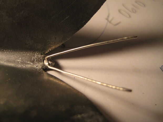 Tira un sólido hilo para antenas. Asegúrese de que el cable es lo suficientemente rígido para posar. Cortar las tiras de unos 2 x más de cuánto tiempo desea que su antenas para ser. El cable de alimentación a través del agujero y luego lo lazo detrás a través de y tirando firmemente. Les de la soldadura en el lugar y cortar el acceso.