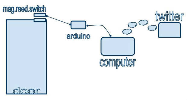 Atribuimos el sensor magnético reed a mi puerta de la oficina y el marco de la puerta. Un cable va desde el sensor de magReed con un conector en el circuito de Arduino. Arduino relojes estado de ese pin, alto o bajo, y cuando el estado cambia de uno a otro Arduino informes sobre que el cambio a través de Serial(). El Python bosquejo recoge la llamada de Serial() y comprueba a ver si el estado actual es la misma que la última publicada en Twitter. Si los dos Estados son iguales, entonces no lo publicaré, pero si el nuevo estado es el estado anterior, entonces estamos en el negocio.