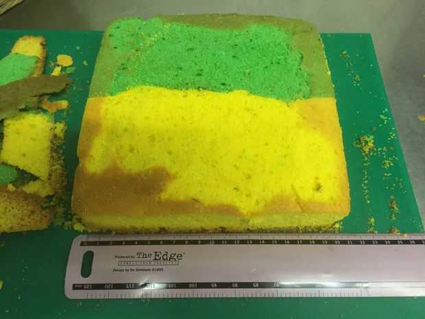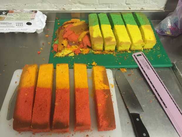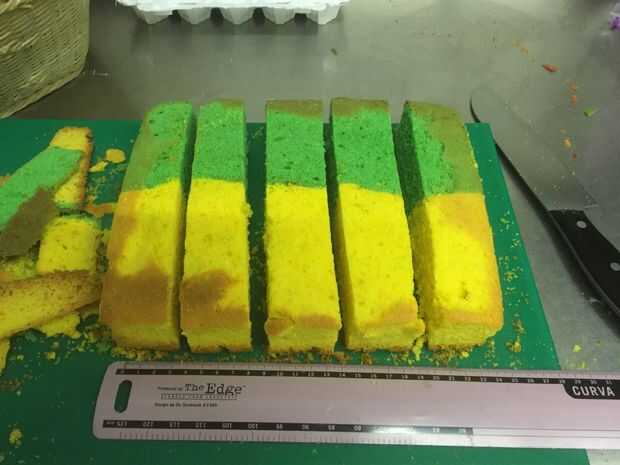 Luego cortar en 5 bloques incluso a través de los 2 colores (como se muestra).
