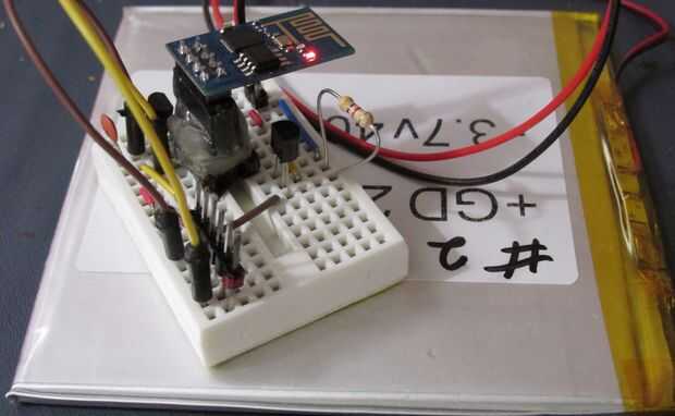 Aquí está una foto de mi hardware del sensor. En lugar de utilizar 2 pilas AA, usé una batería de iones de litio (la gran plaza por debajo de la protoboard. Así solía un regulador de voltaje L4931 para reducir a 3.3Vdc.