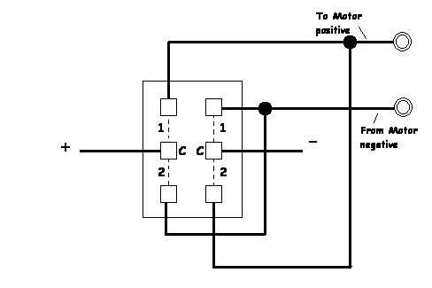 Este diagrama muestra el interruptor DPDT, con una posición de centro OFF (necesario para poder girar el motor apagado) el + y - es de la batería terminal conexiones a los terminales de centro (común) del interruptor. Los números (1 y 2) indican las conexiones hechas dentro del interruptor cuando el interruptor está en la (1) posición o en la posición de (2). Tenga en cuenta las gotas. Muestra que los cables estén conectados. Todos los demás cables están de paso sobre la otra. Otra cosa... Puede utilizar dos SPDT interruptores al lado de lo físicamente la abrazadera la alterna para lograr el mismo efecto. Con los interruptores en direcciones opuestas se conectarán ambos interruptores a positivo o negativo de la batería y el motor no marcha.