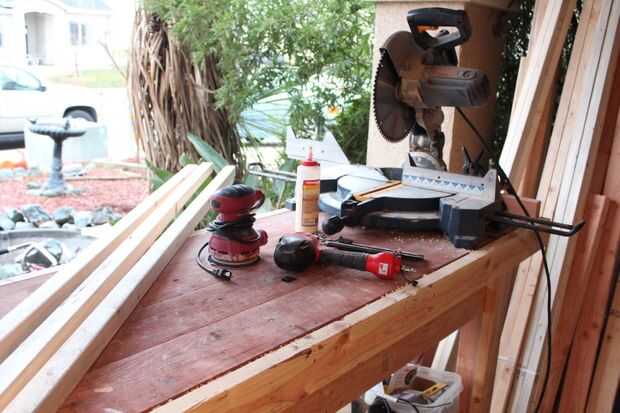 Inglete, Sierra, pistola de clavos, clavos de 2 pulgadas, pintura, mancha, pegamento, lijadora orbital, frote en poliuretano. Cosas muy básicas.