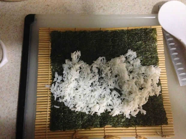 -Extender y aplanar suficiente arroz en el alga marina que deja más espacio en la parte superior en comparación con la parte inferior y coloque los ingredientes en la parte media inferior.