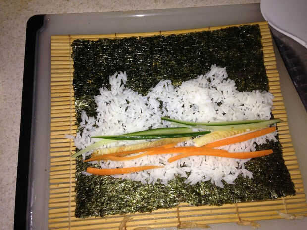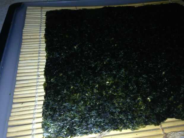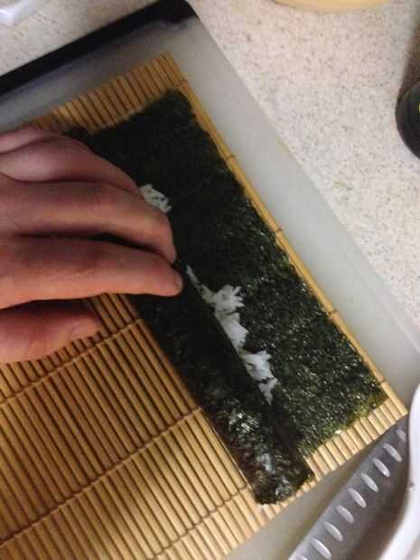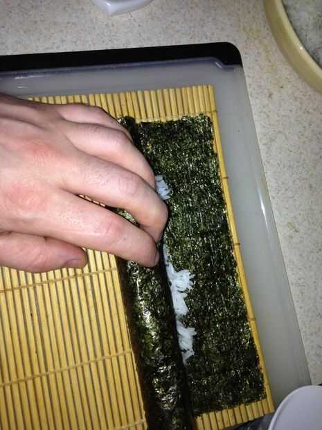 -Empezar el rollo por los bancos durante aproximadamente 1/4 de las algas y presione un poco. Esto debería hacer pegar y mantener las cosas en su lugar mientras usted se salga del rodillo del sushi.