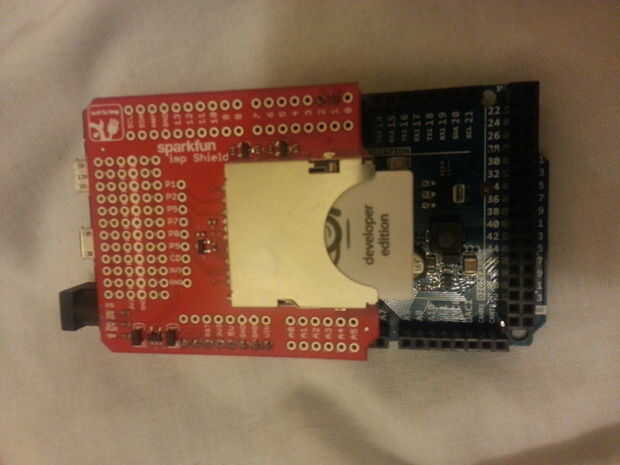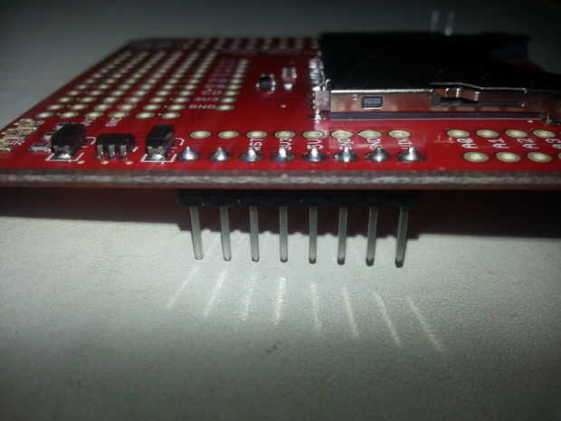 Primero tienes que soldar los encabezados en el escudo de electric imp, a poder que usted necesita tener 5V y GND conectado desde el Arduino debido al escudo de Imp eléctrico por lo que son realmente los únicos que tienes que soldar pero es mejor hacerlo al menos una fila como usted puede ver en las fotos.