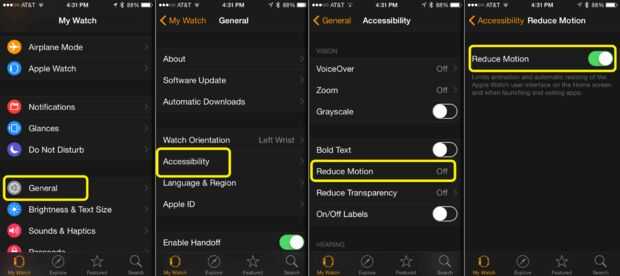Aplicación de Apple Watch / General / accesibilidad / reducir movimiento sucesivamente