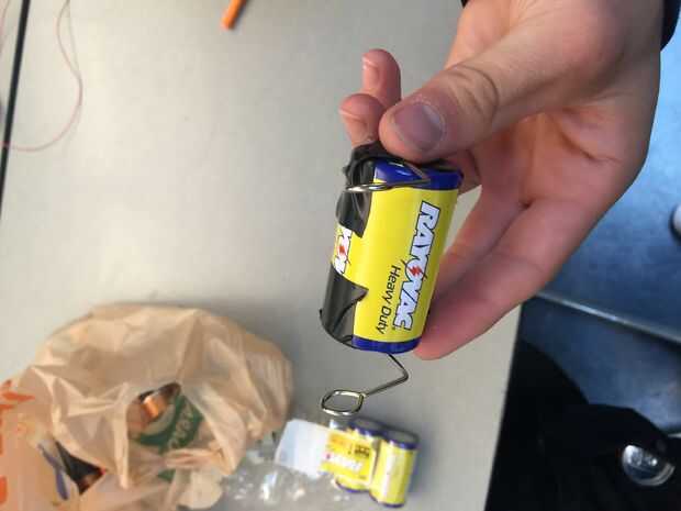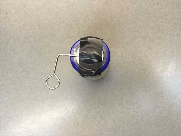 Corta dos trozos cortos de cinta de abastecimientos y póngala a un lado. a continuación, coge el uno sobre el uso de barras de metal (aguja) y D-battery.after Coloque la varilla de metal sobre el negitive, lado positivo y cinta abajo la aguja horizontalmente