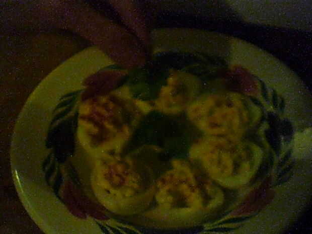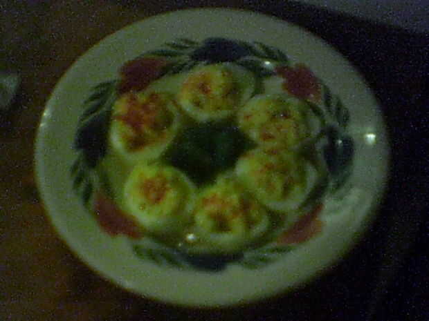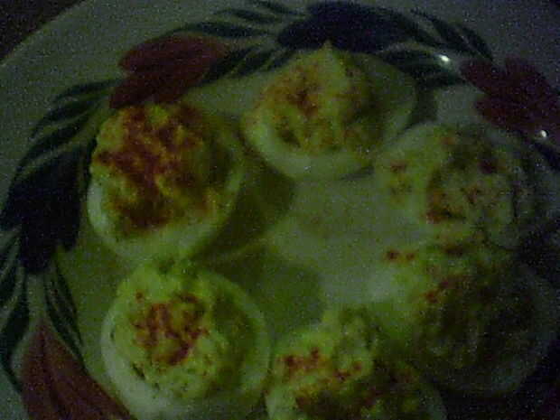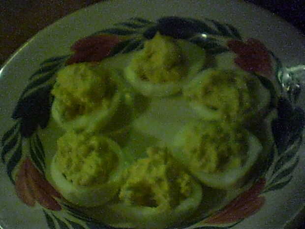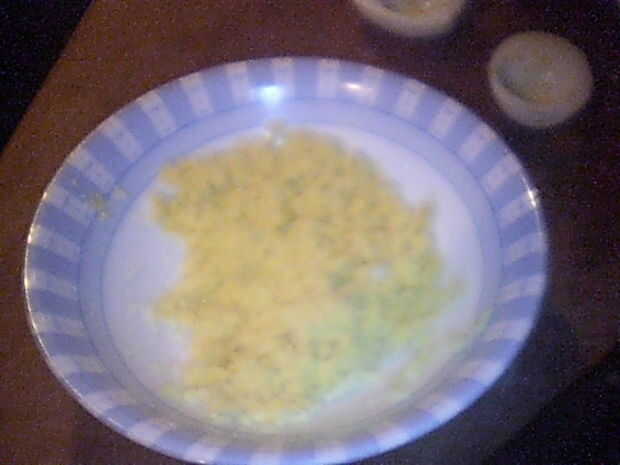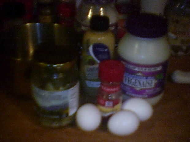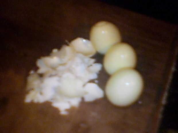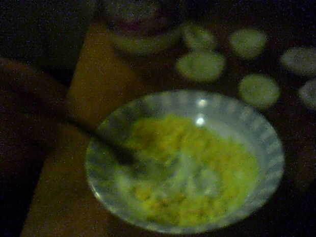 Tomar una cucharada de mayonesa y media cucharadita de mostaza y mezclar con las yemas.