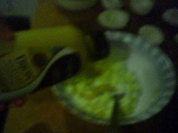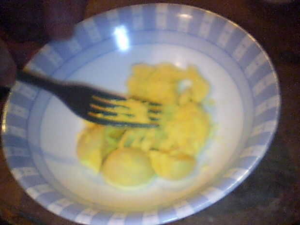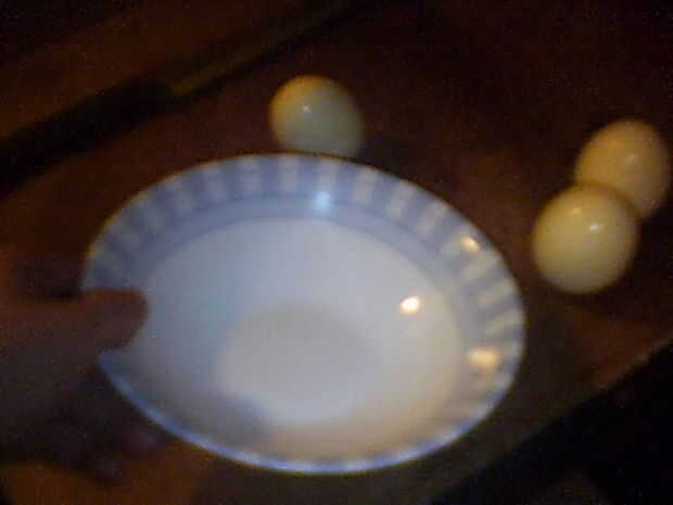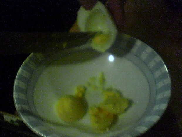 Sacar el recipiente y retire con cuidado, sin romper las claras, las yemas en el tazón de fuente. Una vez hecho eso, romper todos los grumos grandes de yema de huevo hasta que todas las piezas son más pequeñas que un guisante.