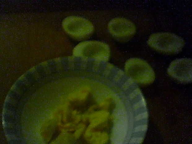 Colocar las claras de huevo vacías en un plato y repartir la mezcla de yema de huevo entre ellos.
