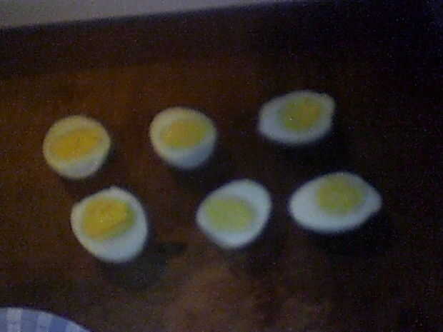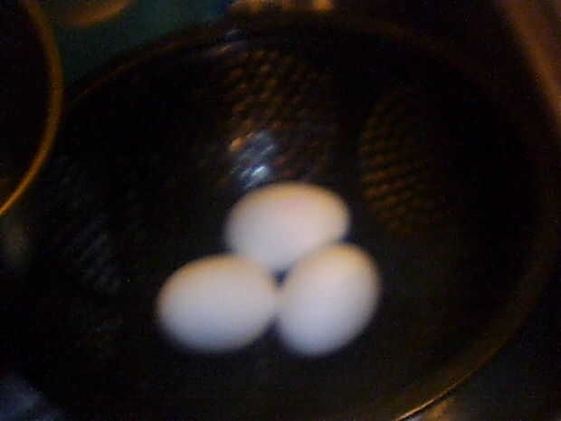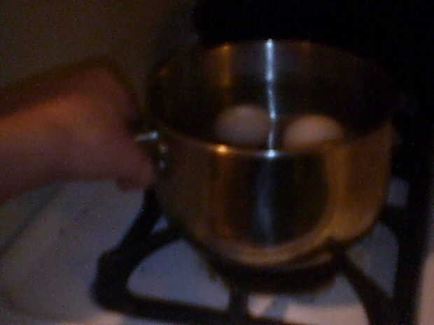 Primero, llene la olla con agua hasta que tenga lo suficiente para cubrir completamente los huevos. Luego poner los huevos en la parte superior de la estufa en HI y ponerlas a hervir suavemente.