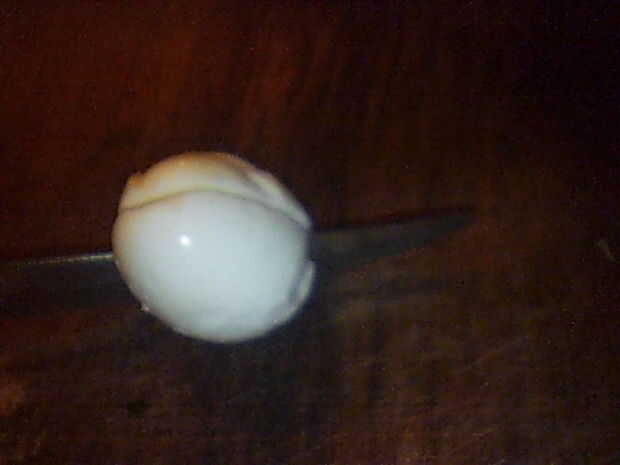 Ahora soporte un huevo pelado en su extremo y cortar recto de arriba a abajo. Repita con los otros huevos.