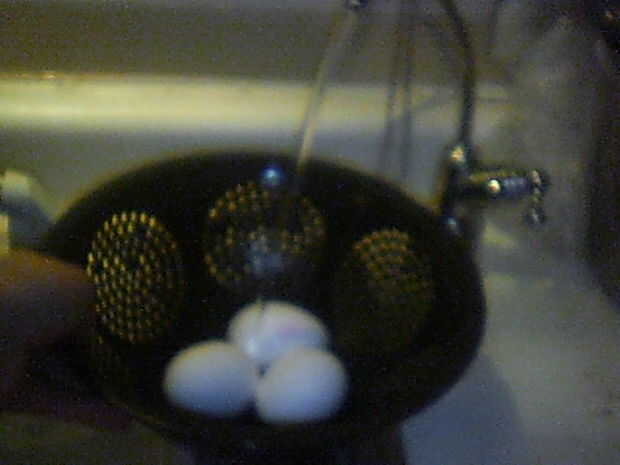 Cuando han pasado los 11 minutos, volcar los huevos (sobre el fregadero) en el colador y vierta agua fría sobre ellos hasta que estén lo suficientemente frías como para manejar.
