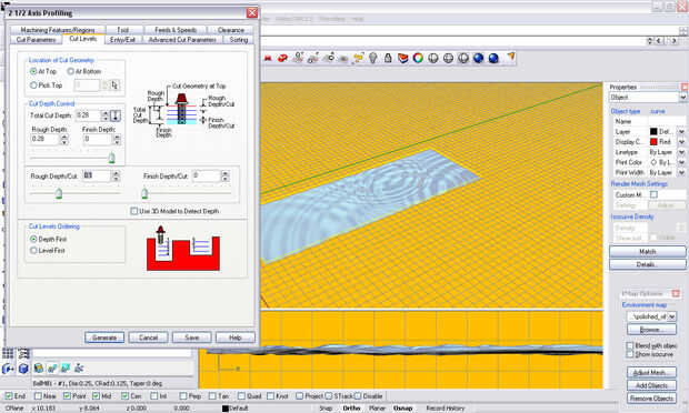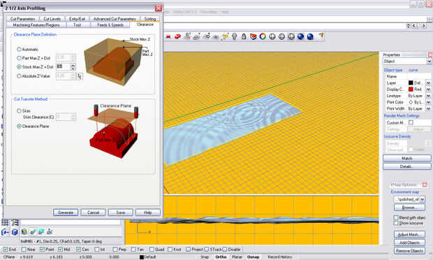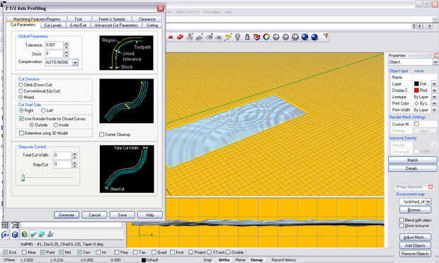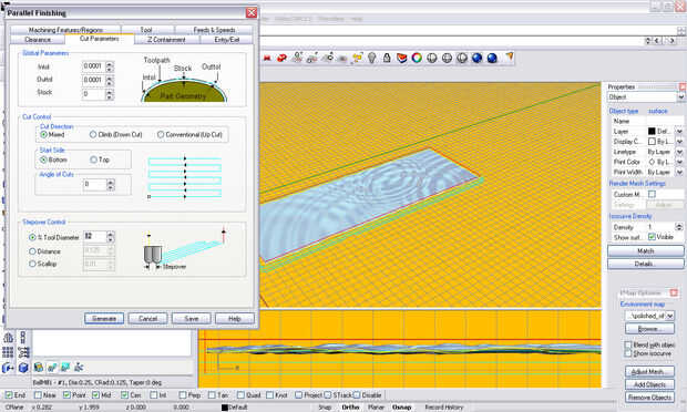Paso 48: La mayor parte de nuestros valores ya será guardar de nuestra trayectoria pasada. En la ficha de parámetros de corte, cambie el Intol y Outtol a 0001. Esto sólo es necesario debido al extremadamente sutil detalle de la geometría de la gota de agua. Este ajuste indica RhinoCAM a qué distancia debe atenerse a la geometría de la pieza.
