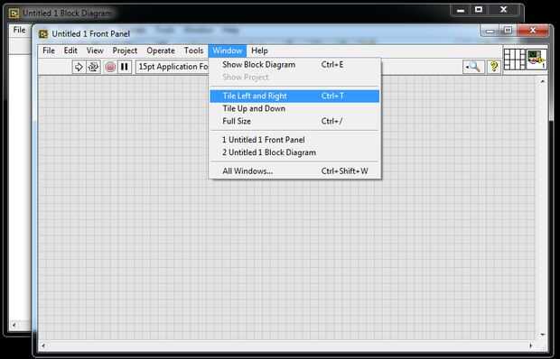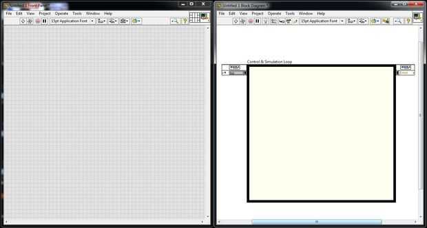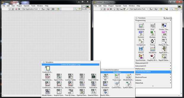 Antes de realizar la tarea es una buena idea dividir el Panel frontal y diagrama de bloques en dos mitades de la pantalla. Ir al menú "Ventana" y haga clic en "Azulejo de la izquierda y derecha". Esto dividirá el Panel frontal y diagrama de bloques en dos mitades. Ahora mueva el cursor a diagrama de bloque y haga clic derecho para obtener la lista de plataformas. Ir a "Control y simulación", luego "Simulación" y haga clic en el "lazo de Control y simulación". Arrastre a un tamaño más grande colocando en el diagrama de bloques.