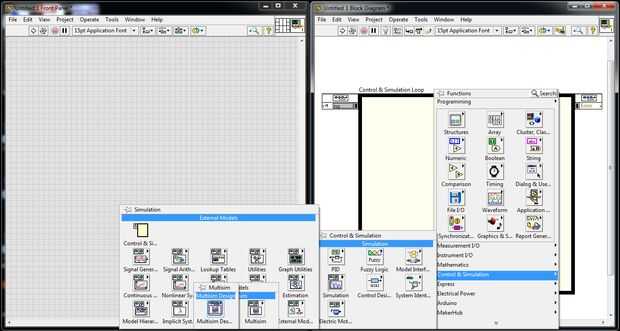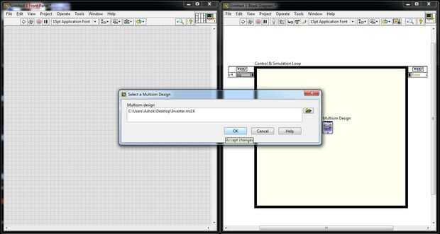 Tenemos que importar el archivo de diseño Multisim en el Control y el lazo de simulación. Vaya otra vez a las paletas en el diagrama de bloques por el camino "Control y simulación", luego "Simulación", luego "Modelos externos" y "Diseño Multisim". Luego te preguntará por la ruta del archivo. Espero que recuerdes el camino. Elegir la ruta de acceso y haga clic en Aceptar. Observará los nombres jerárquico conectores mostrados en el diseño de Multisim importado.
