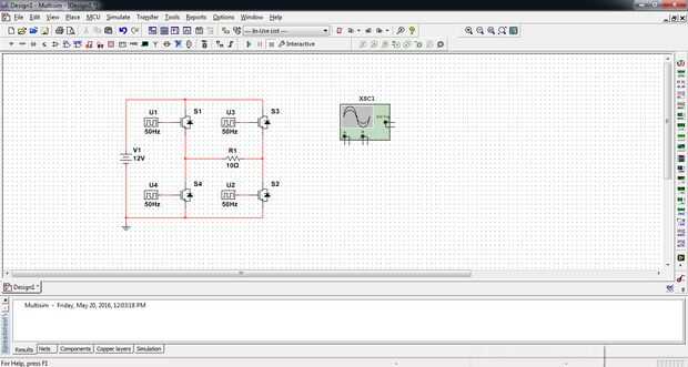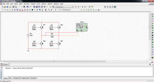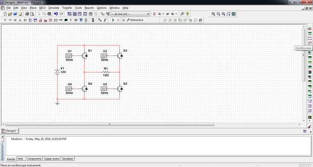 Mover el cursor al lado derecho de la pantalla donde hay una lista de los iconos que se utilizan para la medida. Seleccione el osciloscopio que es el 4 º desde la parte superior. Colocar el osciloscopio y conecte el osciloscopio a través de la resistencia como se muestra en la captura de pantalla.
