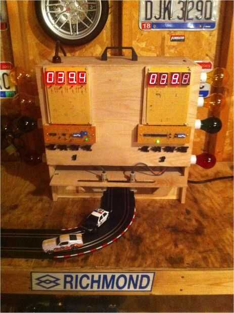 Foto del producto final. Todo, incluyendo temporizadores fue construido desde cero. Utilizando una pista de carreras de coche de ranura pude construir un simulador PLC conducido. Con un tirón de un interruptor, arrastre raza del punto al B o completar 5 vueltas para ver quien es el más rápido. Árbol de luz para cada carril indicar quién ganó o quien fue descalificado por salir a pronto. Actualmente estoy trabajando en una versión de microcontrolador 8051. Voy a publicar cuando se haya completado. Este proyecto fue mi proyecto final en el ITT Tech gracias para su visualización.