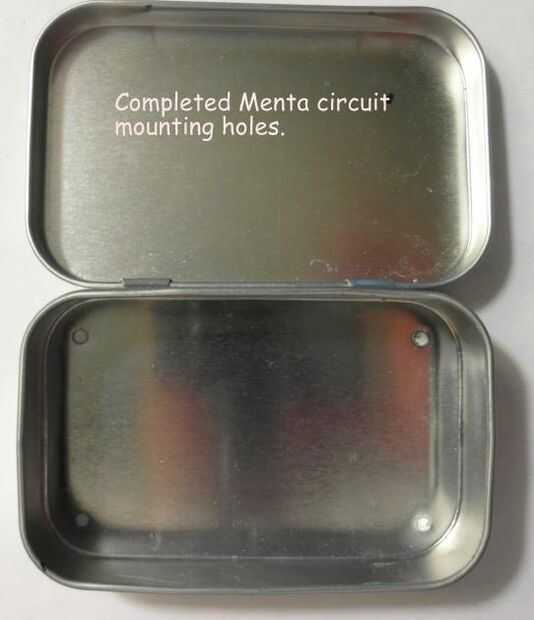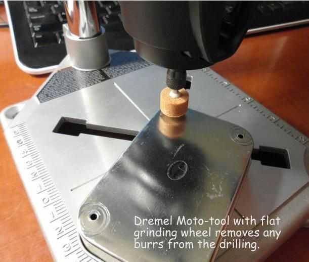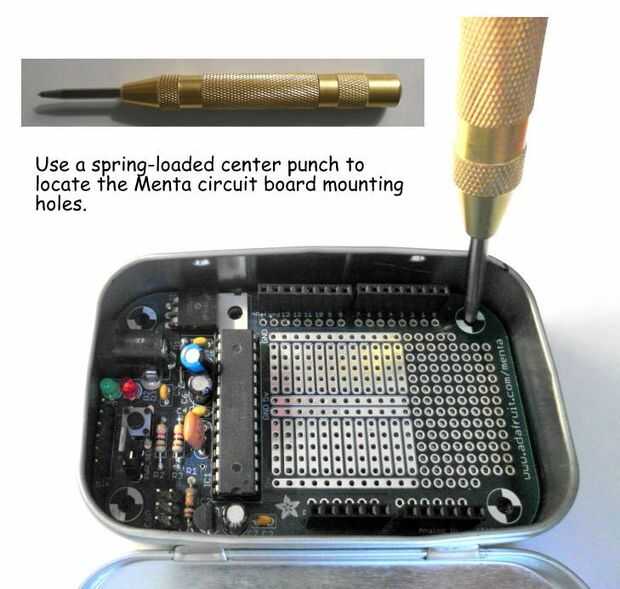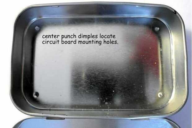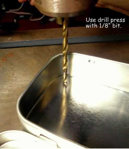 Ahora los agujeros de la placa de circuito se pueden perforar con un taladro de mesa. Los agujeros de Adafruit Menta miden 7/64" de diámetro para una 1/8" broca parecía conveniente. La siguiente foto muestra el taladro en acción. Los orificios resultantes en la parte inferior de la lata Altoids han irregular "fresas" después de la perforación para que estos puedan ser tierra hacia abajo usando un Dremel MotoTool con una plana de muela.