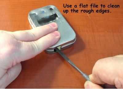 Después de hacer algún recorte, se limpió el agujero cuadrado con una lima de mano (cuarta foto). En la quinta foto se muestra el producto final.