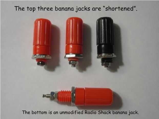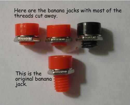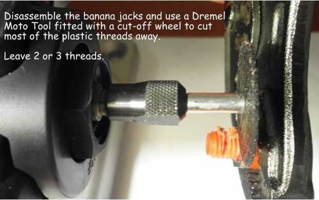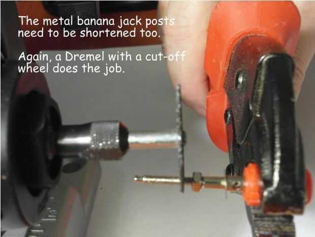 El poste metálico de banana jack tiene que acortarse demasiado. Dejando una tuerca de rosca como se muestra en la tercera foto, use un Dremel MotoTool corte disco para cortar el poste, dejando tres o cuatro hilos.