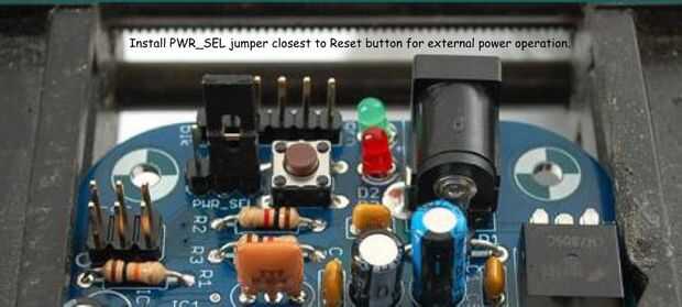 Menta es para alimentación externa (no por USB). El puente de potencia está a la izquierda del botón de Reset, como se muestra en la primera foto de abajo. Para seleccionar la alimentación externa a través de la toma, establecer el puente a la derecha como se muestra.