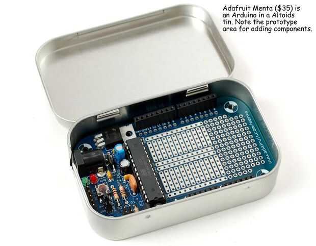 ATMega328P microprocesador de 8 bits con 32k de memoria Flash y 2k de RAM. Observe que la señora Ada diseñado para que quepa en una caja de Altoids estilo metal.