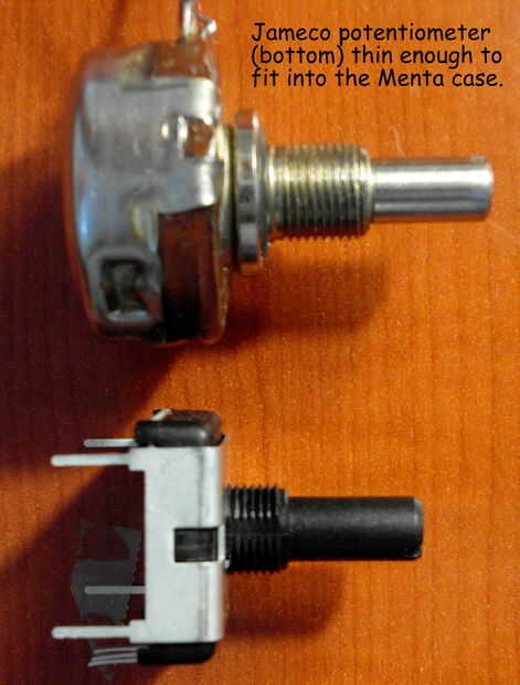 Por el pote ajustar el ritmo cardíaco, me encontré con el típico bote disponible de Radio Shack y Adafruit para ser demasiado gruesas para el caso de la Menta. Buscando en el catálogo de Jameco, encontré un bote diseñado para montarse en placa de circuito que es algo más delgado.