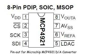 No mucho después adquirí el chip de Microchip D/A, Adafruit ofreció un dispositivo de dos canales D/A en un tablero de arranque por $4.95. Estoy seguro de que este dispositivo sea también ideal para esta aplicación. El MCP4921 de Microchip puede pedirse de Digikey para $2,36. El esquema de los terminales de la MCP4921 se da a continuación.