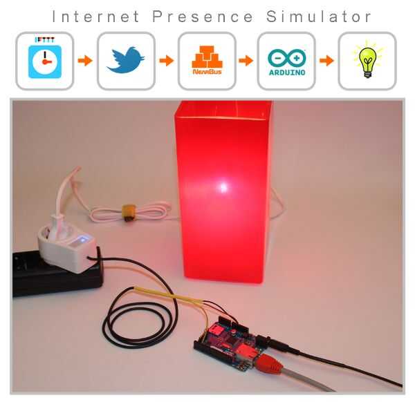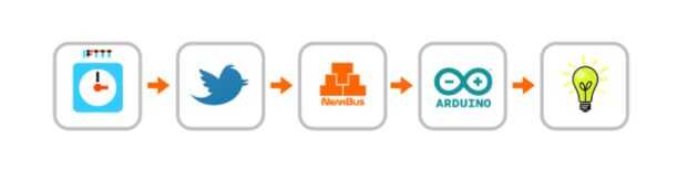 Como se muestra en la imagen el sistema consta de un reloj configurable de Internet que envía ON / OFF mensajes a través de Twitter en el conector NearBus. El conector NearBus reenvía estos mensajes a la placa Arduino Ethernet (a través de Internet) que se enciende y da vuelta apagado un interruptor de potencia que permite de esta manera a controlar la forma de luz cualquier lugar con un simple navegador.