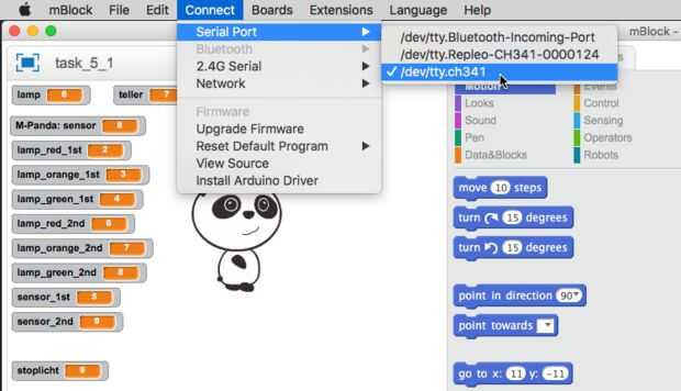 Si tienes un Arduino con un interfaz CH340 o CH341, necesita el controlador correcto para poder conectar el Arduino con tu Mac o pc. En OS X conductores deben ser firmados en la actualidad, sí se puede deshabilitar firma de kext, pero le hace Mac menos seguro. Aunque hay libre controladores firmados disponibles como aquí en Techblog de Björn, no funcionó para mí y por lo tanto pasó algunos dólares en un driver USB Serial CH340/CH341 comercial de Repleo. Cuando se conecte desde mBlock al puerto serie USB, existe la posibilidad de que usted es capaz de seleccionar el puerto, pero no puede conectarse. Se puede detectar si una marca de verificación no se muestra después de seleccionar el puerto serie. Esto es causado por mBlock que parece tener un problema con el manejo de nombres de puertos específicos, puede ser longitud de la nombre o caracteres específicos en ella. Esto puede resolverse fácilmente haciendo un nuevo enlace con un nombre corto para el largo nombre del controlador.