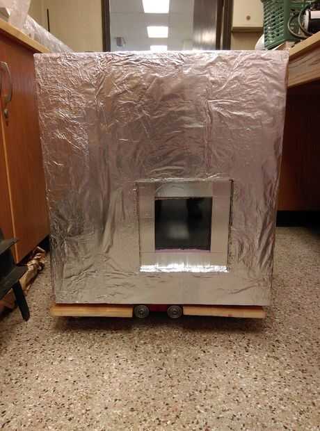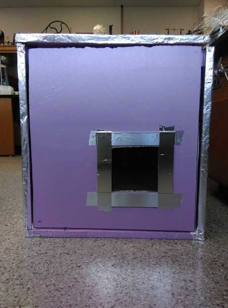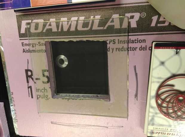 A continuación, creamos una ventana en la pieza final por lo que podemos mirar a la cámara mientras se está ejecutando. Esto es importante para nosotros porque estamos poniendo electrónica en la cámara y queremos tener la capacidad para ver si están todavía en y funcionando correctamente. Utilizamos dos cuadrados de 10 "x 10" de Lexan sobrado de las tapas como la de la ventana. Después de cortar un cuadrado en el pedazo de extremo de espuma de poliestireno, gorila nos pegan los dos cuadrados a cada lado. Este extremo de la cámara, como el otro, es también doble acodada, por lo que cortar un cuadrado en el pedazo más grande de la espuma de poliestireno y había pegado a la pieza de extremo interior.