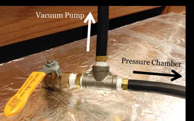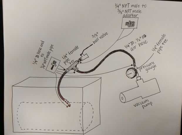 Puesto que hay muchas maneras que el mismo objetivo podría ser alcanzado, las piezas que pueden no ser necesarias para otro proyecto similar. Utilizamos accesorios de tubería NPT (rosca de tubería nacional). Wikipedia tiene información básica sobre el TNP y que todo los diversos números, que es útil cuando se trata de determinar que piezas comprar (https://en.wikipedia.org/wiki/National_pipe_thread). Los diagramas muestran el diseño (con la etiqueta y no) que hemos elegido conectar la bomba de vacío a la cámara de presión.