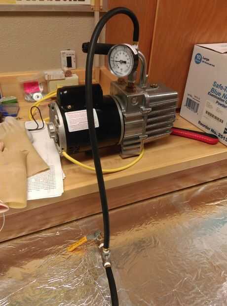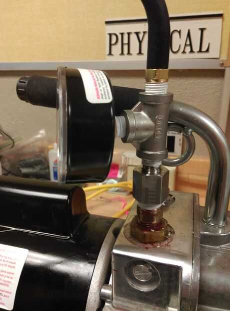 El tercer lado de la t de la pipa debe un ¼" NPT macho conexión manguera final, luego una manguera funciona desde aquí la bomba de vacío. Antes de que la manguera alcance la bomba de vacío, utilizamos un ¼" hembra" t "para agregar un medidor de presión. También necesitábamos un ¼" NPT macho a ½" NPT adaptador macho para conectar a la bomba de vacío.