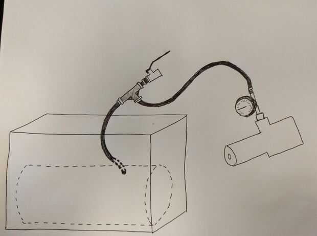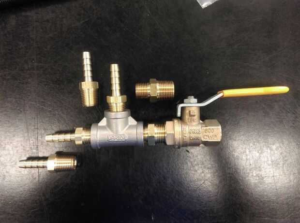 El otro extremo de la manguera conectada a un extremo de la manguera a ¼" acople macho NPT. Esta pieza se atornilla en el extremo de un ¼" hembra" t ". Cinta Teflon fue envuelto todas roscas antes de hacer conexiones. El otro extremo del tee de tubo tiene una válvula de bola conectada a él para dejar salir el aire de la cámara de presión.