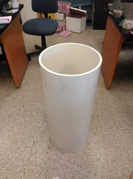 El tubo de PVC que ordenó era de cinco pies de largo, pero por suerte pudimos tenerlo cortado a 34" por los carpinteros en nuestra Universidad. Utilizamos papel de lija para pulir los extremos de la tubería de PVC. A continuación, tuvimos que perforar un agujero para la conexión de la manguera. El agujero fue perforado gradualmente hasta un tamaño de 7/16", y luego un grifo del tubo ¼" fue usado para crear los hilos de rosca en el orificio. A continuación, aplica una pequeña cantidad de epoxi a las roscas de una NPT macho a manguera final de ¼" ¼" y atornillar la grifería en el orificio taladrado.