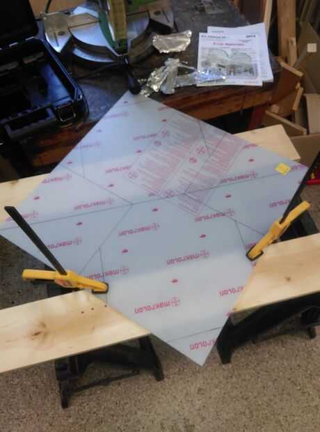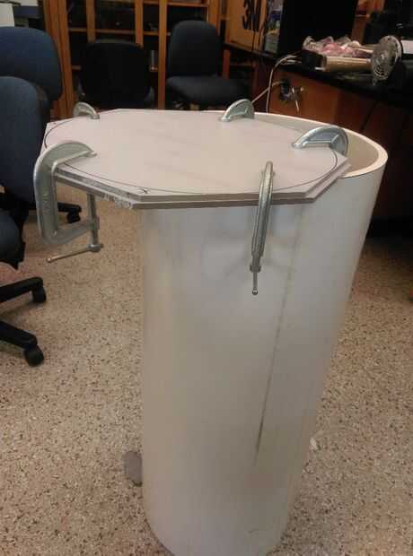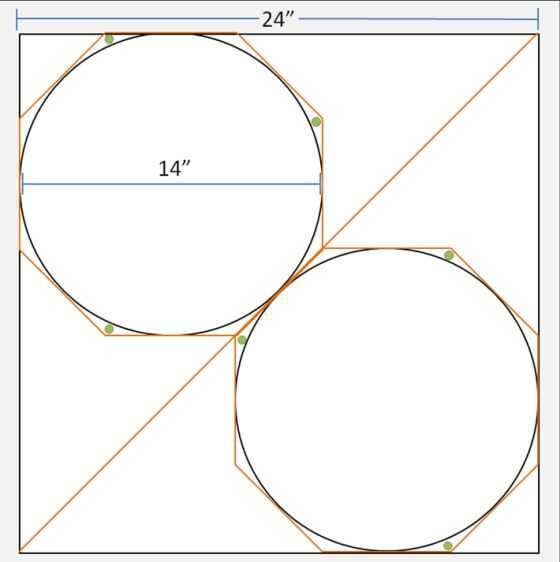 Aceptar la pipa del PVC, nosotros primero remontar los cortes a realizar en la hoja de Lexan. Ambas tapas caben en una hoja de solo 2 x 2 pies, como se muestra. En el diagrama, las líneas naranjas son los cortes que hicimos usando una sierra de calar. A continuación, hemos perforado los agujeros para las varillas roscadas que pasar para mantener las tapas, se indica por los puntos verdes en el diagrama. Sujeta el corte dos pedazos de Lexan para taladrar los agujeros para que alinean perfectamente. Como se puede ver en la figura, los octágonos no son perfectos, pero como encaja sobre el tubo de PVC, que es lo único que importa. Poco a poco hemos perforado el agujero hasta 7/16".