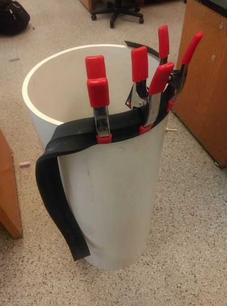 El último paso a la construcción de la cámara de PVC fue poner el sello. Cortamos un trozo de la tira de tiempo de puerta de garaje a ser apenas más largo que la circunferencia de la PVC (aproximadamente 44"). Utilizamos el pegamento gorila para pegar primero una parte del sello al exterior de la tubería de PVC. Se utilizó el pliegue ya en la tira de tiempo como la línea de plegado para el sello. Después de secado el pegamento por la parte exterior, que dobló el sello a lo largo del pliegue y había pegado al borde de la pipa del PVC. Esto terminó la parte de la cámara de presión.