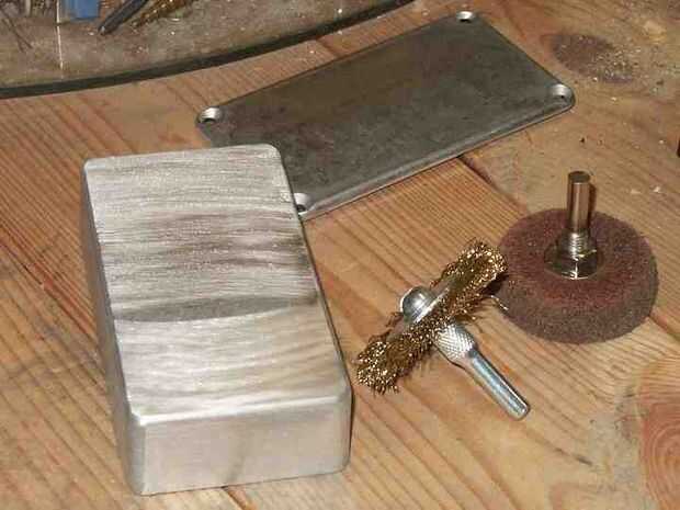 En este ejemplo, la mitad superior de la caja ha sido marcado con una cicatriz con el cepillo de bronce y la parte inferior con el abrasivo.