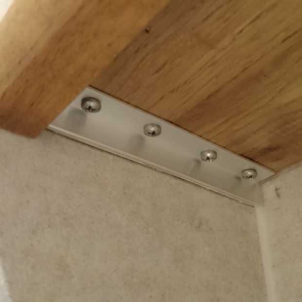 Mi esposa necesitaba algo para cubrir los cables en su escritorio detrás de sus monitores duales. He construido esta pequeña esquina del estante para ella. Le permite utilizar el espacio de otra manera inútil para marcos de cuadros o una planta y esc