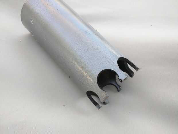 Corte el tubo de abs de 4" a la altura del cañón. Se trata de la tolva de alimentación. Cortar ranuras o taladros en un extremo de la tolva, como se muestra. Esto permitirá que el alimento se derrame hacia fuera en la parte inferior del cañón. He pintado la parte exterior del gris de la mina, pero podría quedar negro.