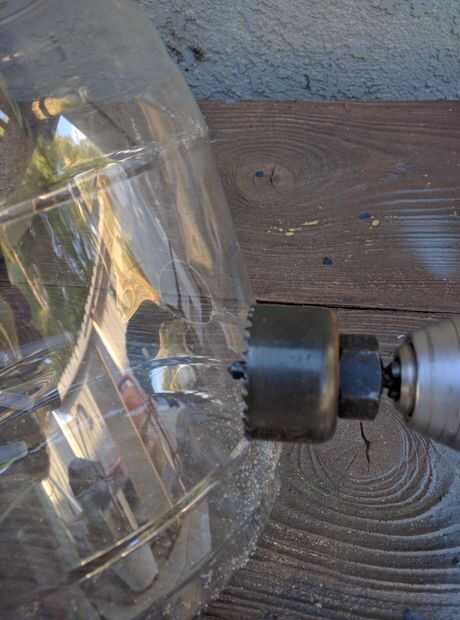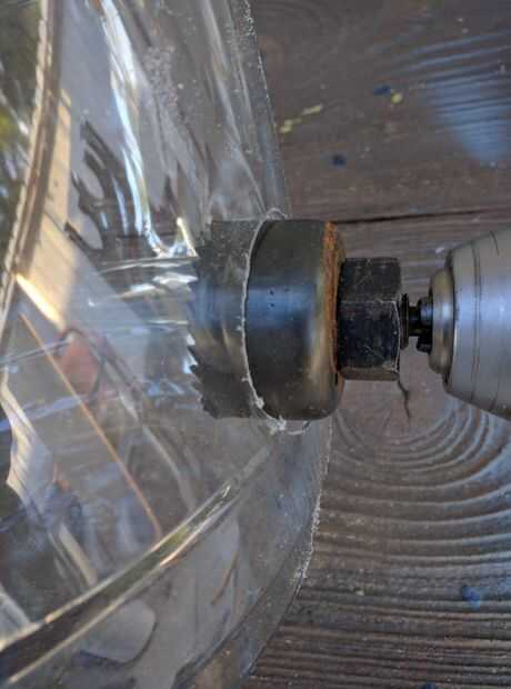 Utilice el serrucho de 1 3/4 de pulgada para cortar los agujeros para los puertos de alimentación en el cañón. Les corté unas pocas pulgadas de la parte inferior. Perfore agujeros igualmente espaciados de 4 a 6. Si no tienes un agujero vio, podría utilizar el anillo de PVC como plantilla y dibujar alrededor de ella en el barril con una pluma Sharpie. En ese momento cuidadosamente podría cortar un agujero en el barril con un cuchillo del exacto o cúter. Puesto que será pegado en el ring en el siguiente paso. el corte no tiene que ser perfectamente lisa.